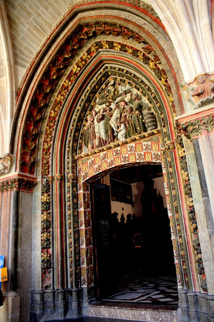 con precioso tímpano con un bello Descendimiento , sobre dintel pintado con las armas de Castilla y León, en el dintel y las jambas, decoración de castillos y leones;