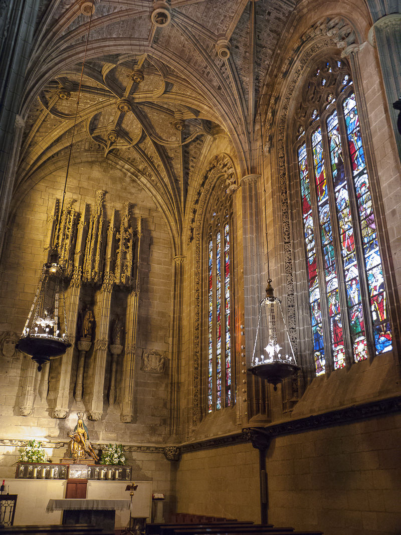 Las vidrieras, aunque restauradas, son del siglo XIII. Aluden a san lldefonso y a san Pedro, a quienes estaba dedicada la capilla en aquella época. Figuran también otros dos obispos: uno suele identificarse con san Froilán, y el otro con san Hipólito.
