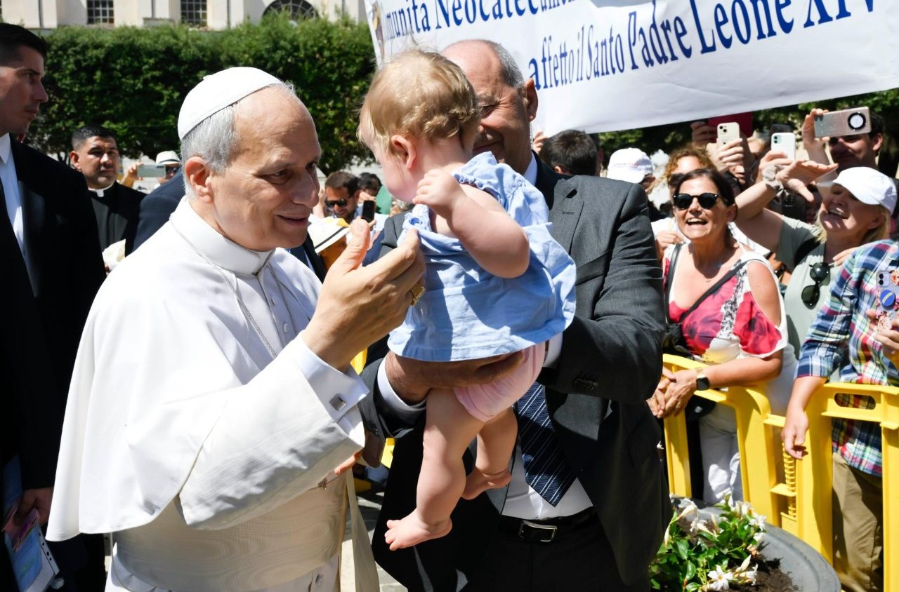 De nuevo en la plaza Pia, justo antes de volver a entrar por el portón de las Villas Pontificias, que da directamente a la plaza, muchas personas esperan a los lados del camino para saludarlo. Algunos quieren una foto, otros acercan a sus bebés para recibir una bendición. A todos León XIV les dedica un momento: una sonrisa, un gesto con la mano, unas palabras, una caricia.